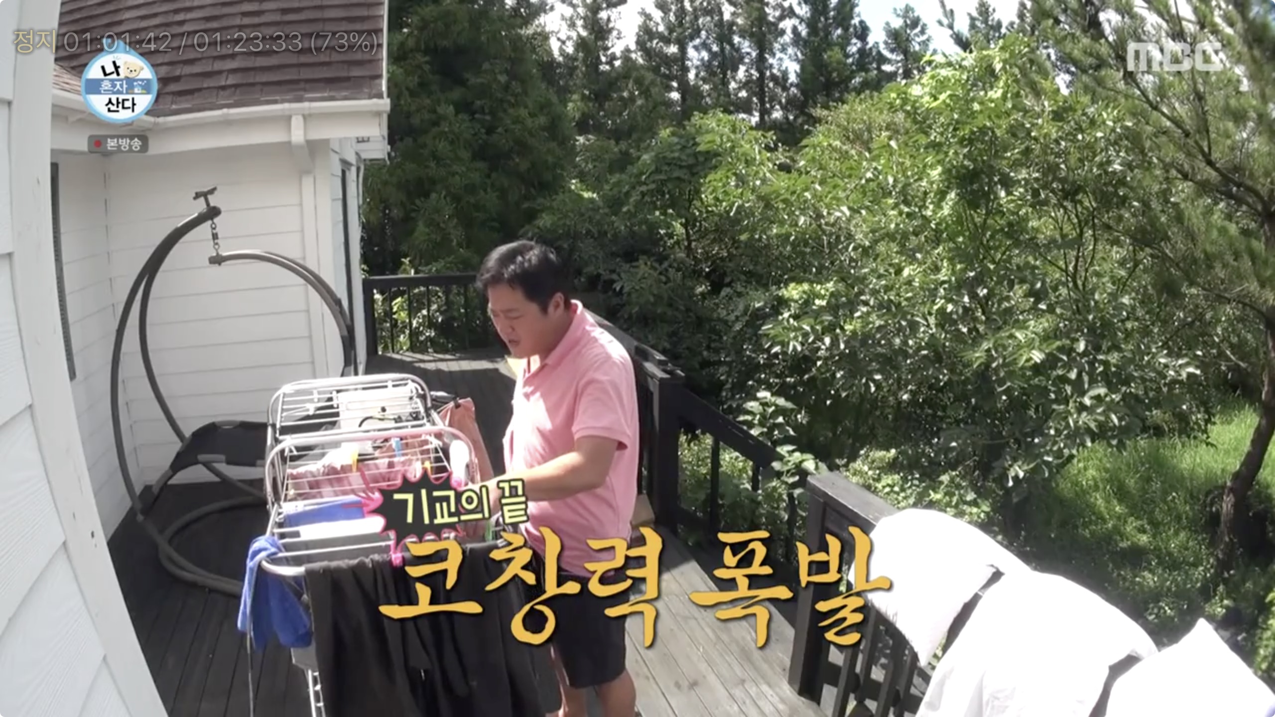 인적 없는 숲속 한복판에서 목청껏 노래를 부르며 신명나는 노동요에 흠뻑 젖어 칼박자에 맞춰 빨래를 널었고요!