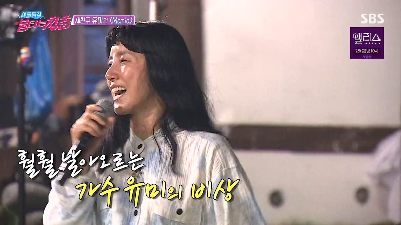 또한 유미는 불후의 명곡 김민종 편에서 김민종의 '하늘 아래서'를 선택해 원곡보다 2키 반을 높여 엄청난 고음으로 가창력을 뽐냈었죠. 특히 그 날 불후의 명곡 방송에는 배우 김아중이 방청석에 모습을 드러내 눈길을 끌었어요. 2006년 영화 '미녀는 괴로워'에 출연한 김아중의 보컬 트레이닝을 유미가 맡으면서 친분을 유지해 왔다고 하네요. 앞서 김아중은 "유미의 지난 번 무대에 너무나 큰 감동을 받았다"고 말하며, 절친 유미를 향한 응원을 건넸답니다! 불타는 청춘에서도 마리아를 불렀죠! 정말 속이 뻥 뜷리는 시원한 고음이었어요! 비록 카메라는 아직 익숙하지 않은 모습이었지만, 그 수줍음이 어쩌면 더 매력이 아닐까요? 노래할 때 가장 행복해보인다는 말이 너무나 이해되는 장면이었습니다.