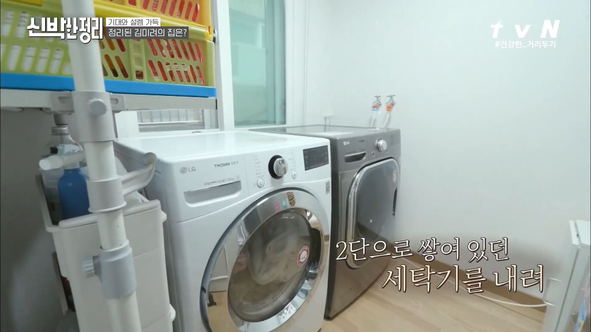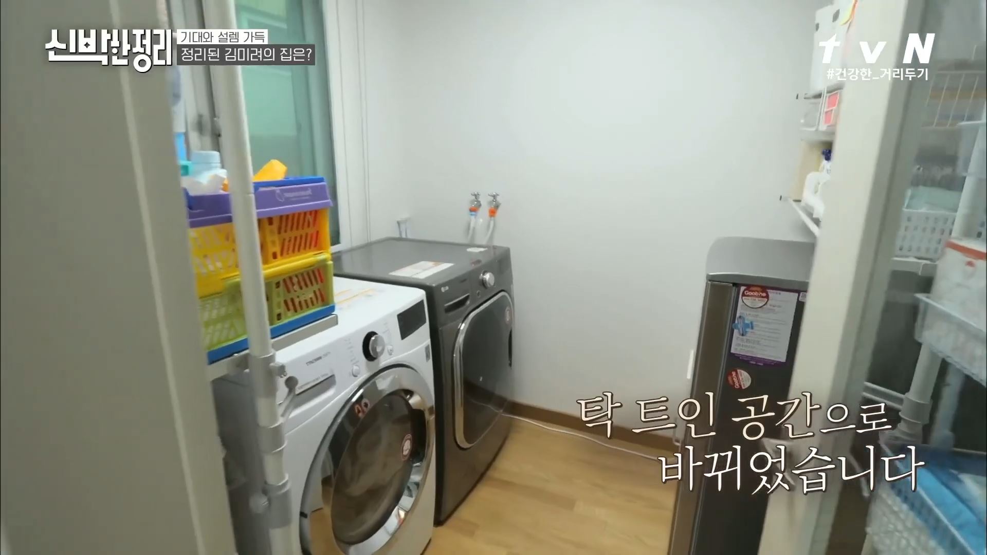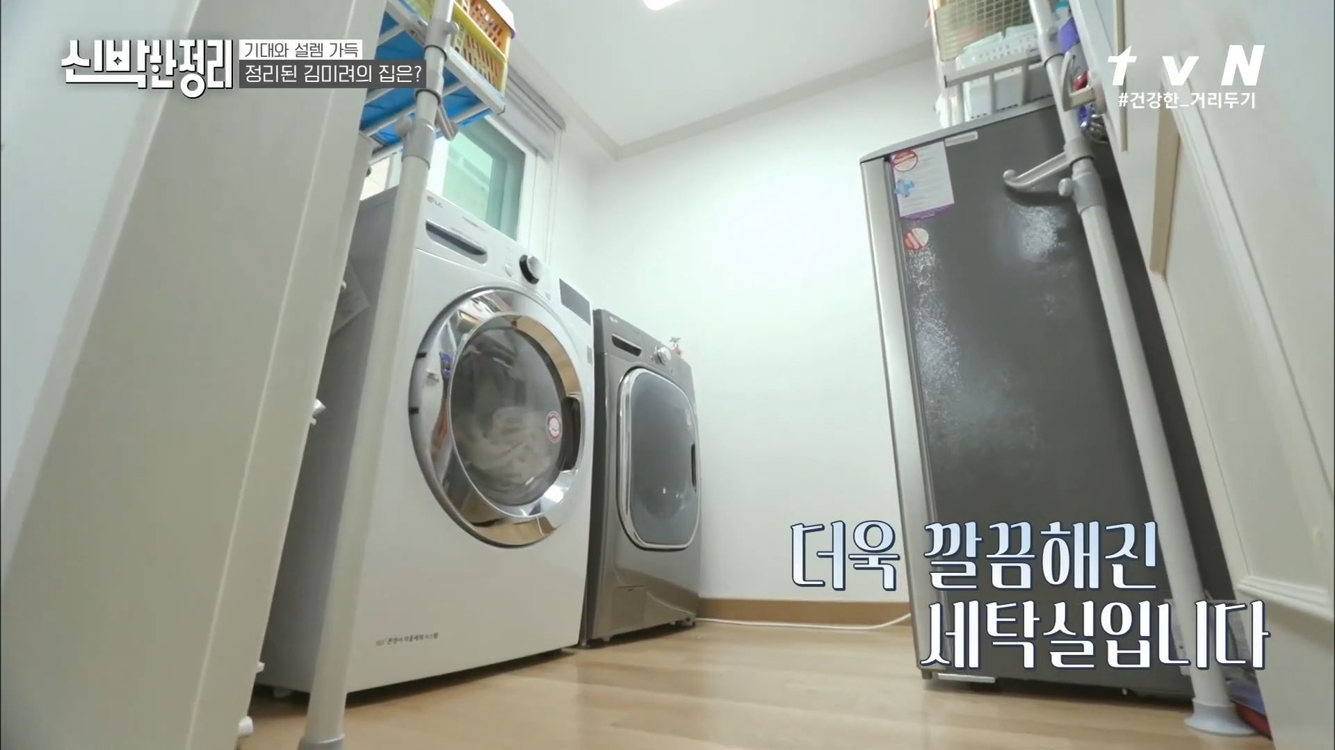 한편 정주리가 '난이도 상'이라고 언급한 김미려, 정성윤 부부의 주방은 수납공간 확보로 정리 질서를 찾아 깔끔하고 심플하게 바뀌었습니다. 큰 가구의 재배치만으로도 탁 트인 공간으로 재탄생한 것입니다. 냉장고의 위치를 바꿔 요리하기 쉬운 공간이 됐고, 심지어 빈 공간까지 만들어졌습니다! 발디딜 틈도 없던 세탁실은 2단으로 쌓여있던 세탁기를 내리면서 말끔히 정리되어 탁 트인 공간으로 다시 태어났습니다. 2단으로 되어 환기조차 어려웠다고 말했었는데요!