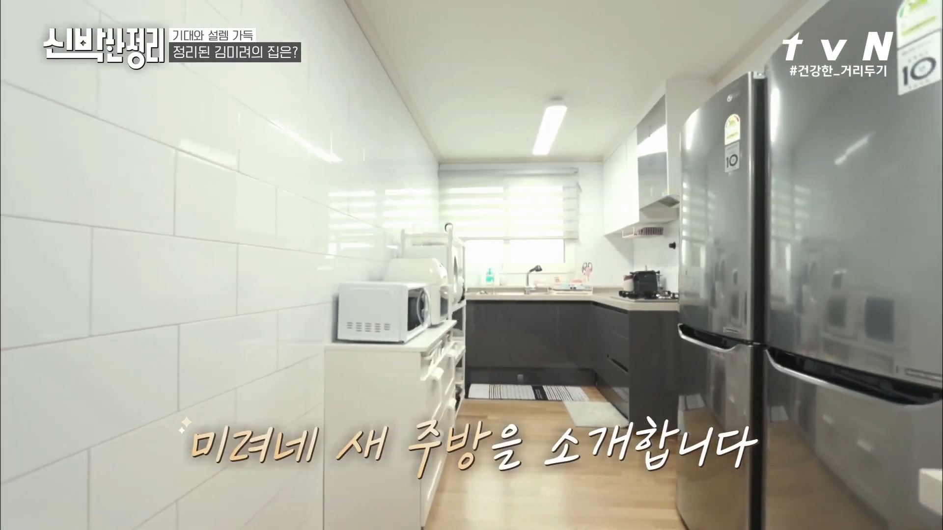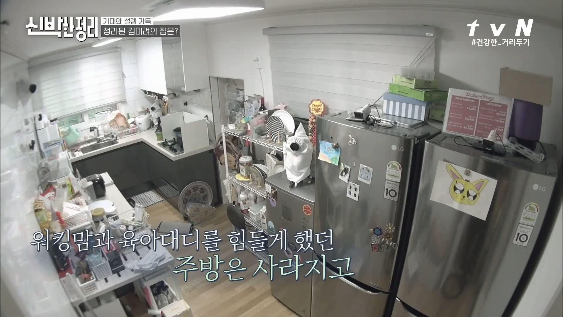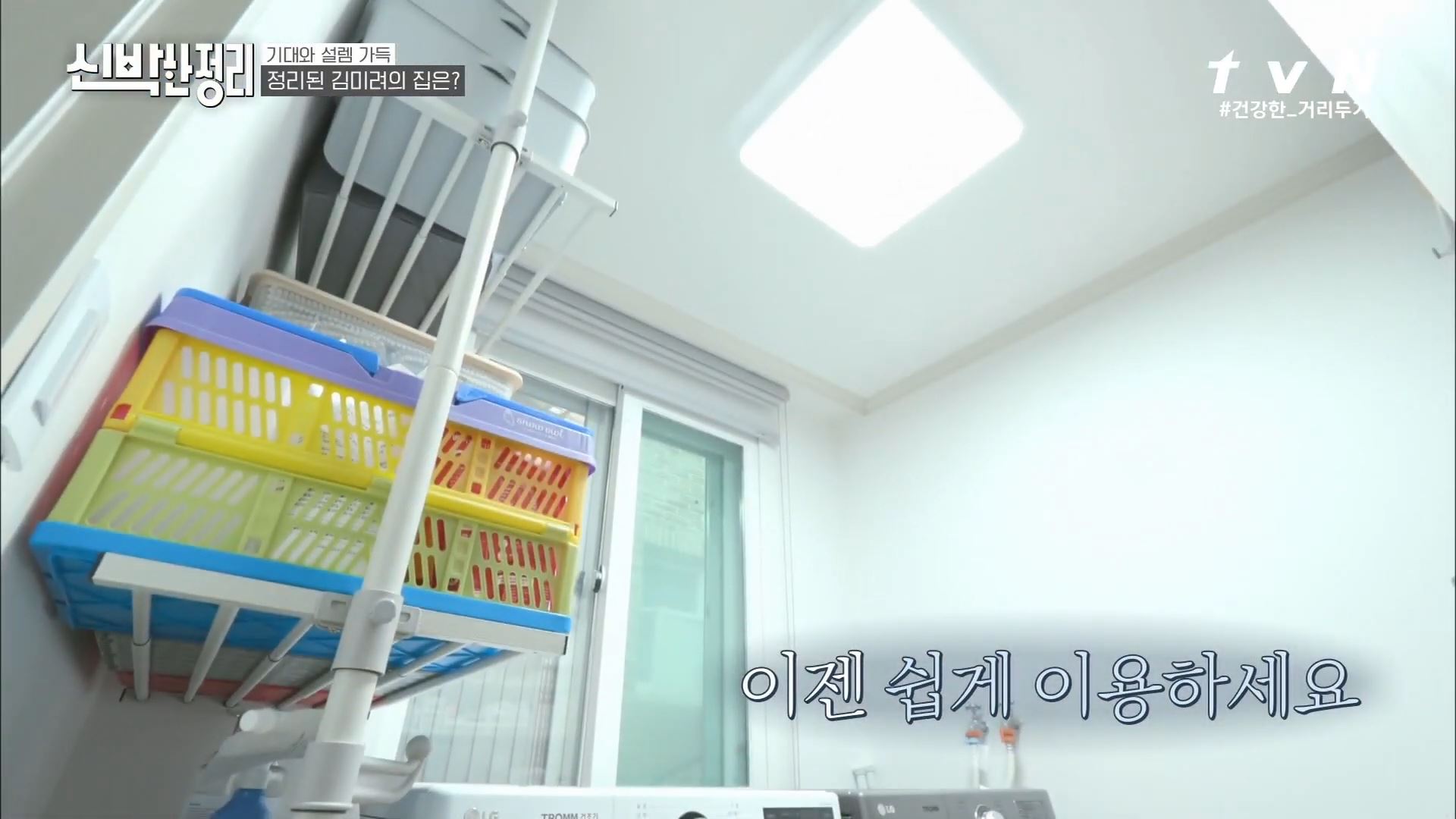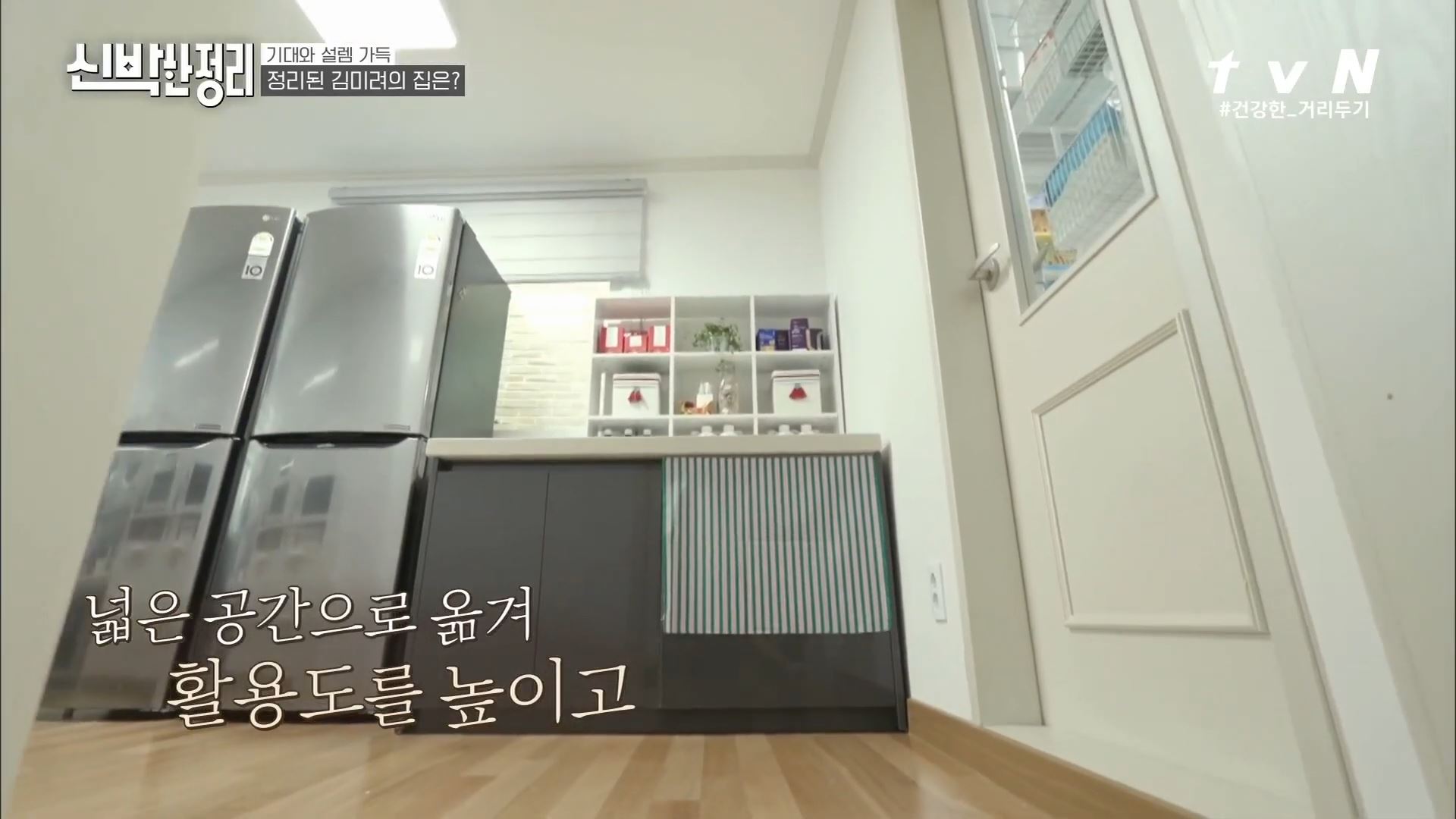 한편 정주리가 '난이도 상'이라고 언급한 김미려, 정성윤 부부의 주방은 수납공간 확보로 정리 질서를 찾아 깔끔하고 심플하게 바뀌었습니다. 큰 가구의 재배치만으로도 탁 트인 공간으로 재탄생한 것입니다. 냉장고의 위치를 바꿔 요리하기 쉬운 공간이 됐고, 심지어 빈 공간까지 만들어졌습니다! 발디딜 틈도 없던 세탁실은 2단으로 쌓여있던 세탁기를 내리면서 말끔히 정리되어 탁 트인 공간으로 다시 태어났습니다. 2단으로 되어 환기조차 어려웠다고 말했었는데요!