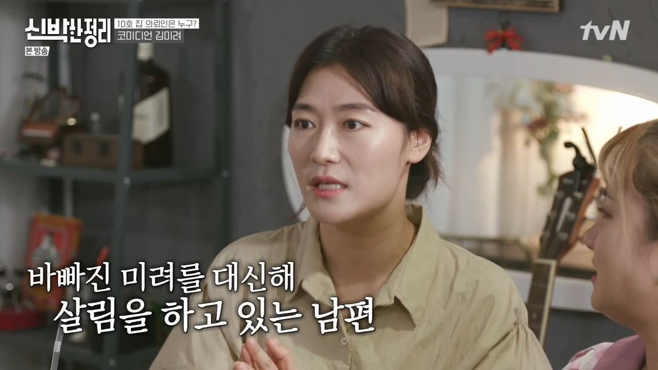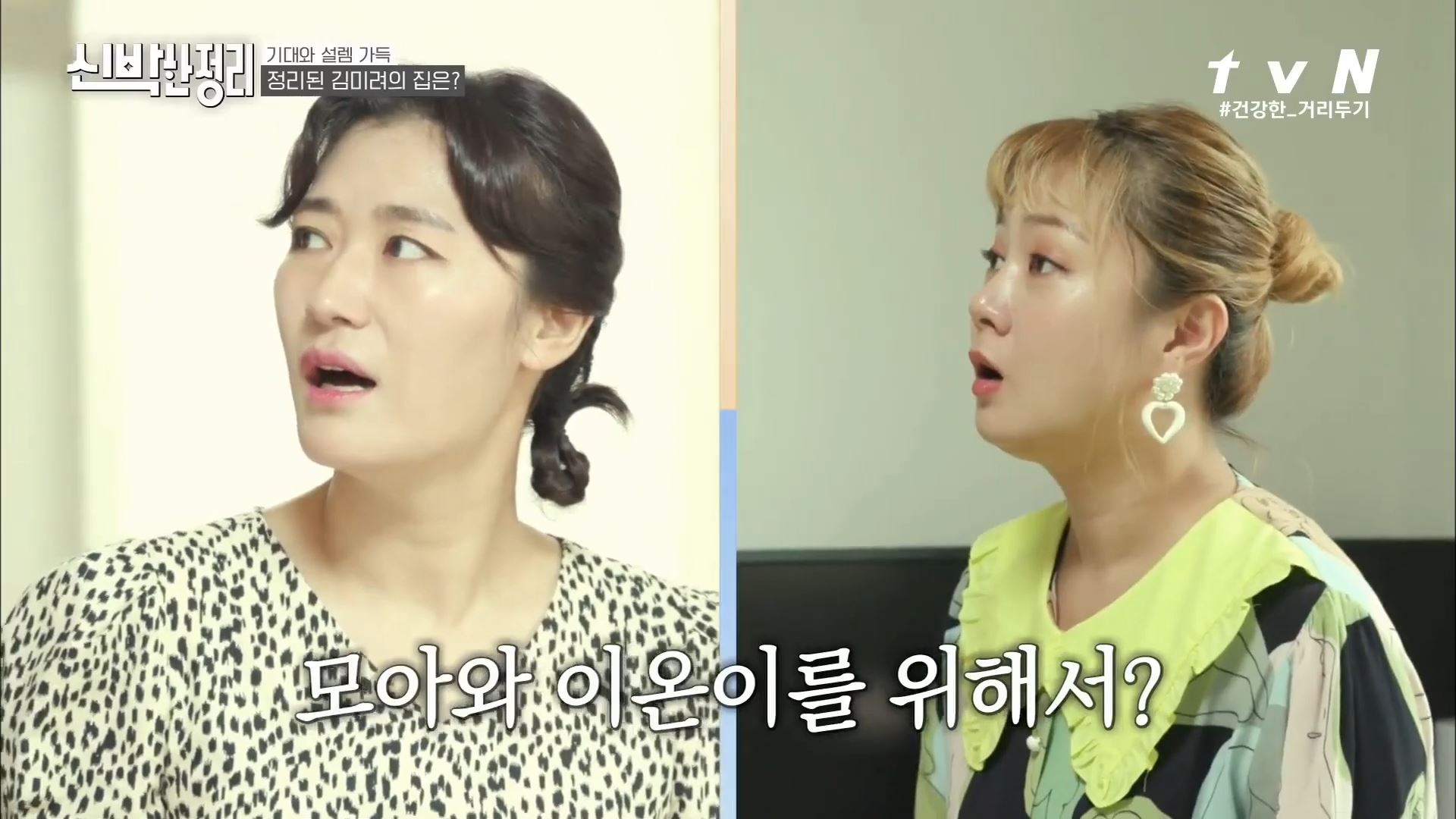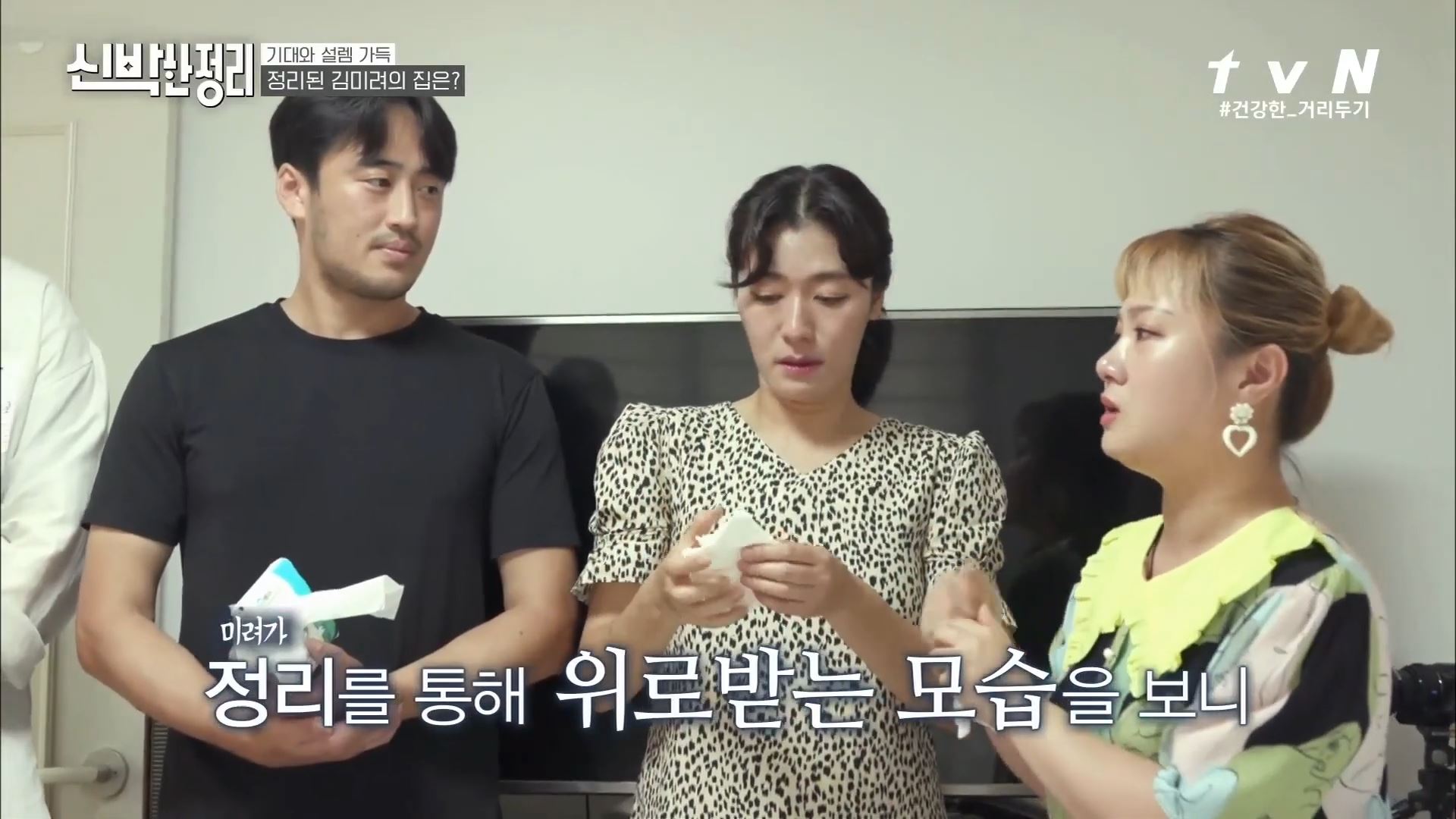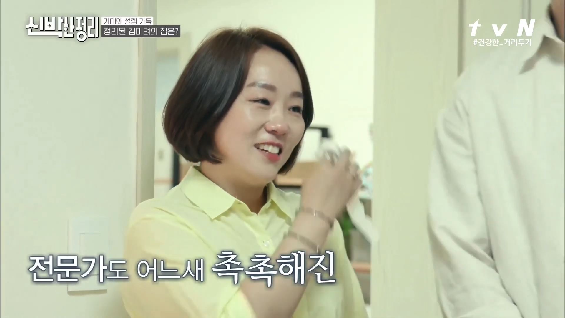 tvN '신박한 정리'에는 열 번째 의뢰인으로 김미려, 정성윤 부부가 출연했습니다. 이날 신애라와 박나래, 윤균상은 정주리의 강력 추천을 받고 김미려의 집을 정리하기로 했습니다. 정리에 앞서 세 사람은 정주리에게 전화를 걸어 김미려 집의 현재 상태(?)를 확인했습니다.