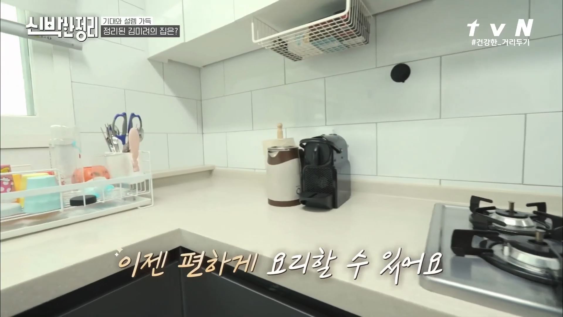 두 사람의 집에서 가장 눈에 띄는 것은 어수선한 부엌이었습니다. 빈틈없이 꽉 찬 싱크대와 수납할 공간의 부족으로 쌓인 물건들과 수납함이었습니다. 김미려 정성윤 두 사람은 함께 약속해놓은 장소 없이 중구난방으로 위치한 짐들에 어려움을 겪고 있었습니다. 특히 제자리를 찾지 못해 매일매일 위치가 바뀌는 물건들, 가득 쌓인 가구들, 잡동사니들로 인해 발 디딜 틈 없이 어지럽혀진 공간 등으로 인해 집안의 동선까지 불편해진 상황이었습니다.