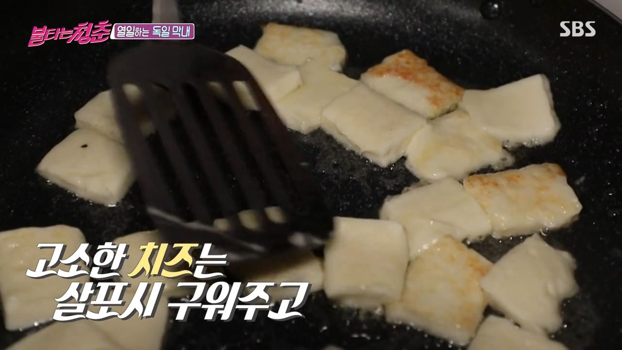 1) 브루노는 굽는 치즈를 가져와서 치즈를 썰어서 구운 후에