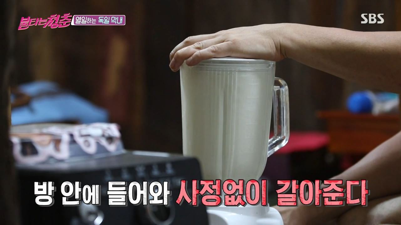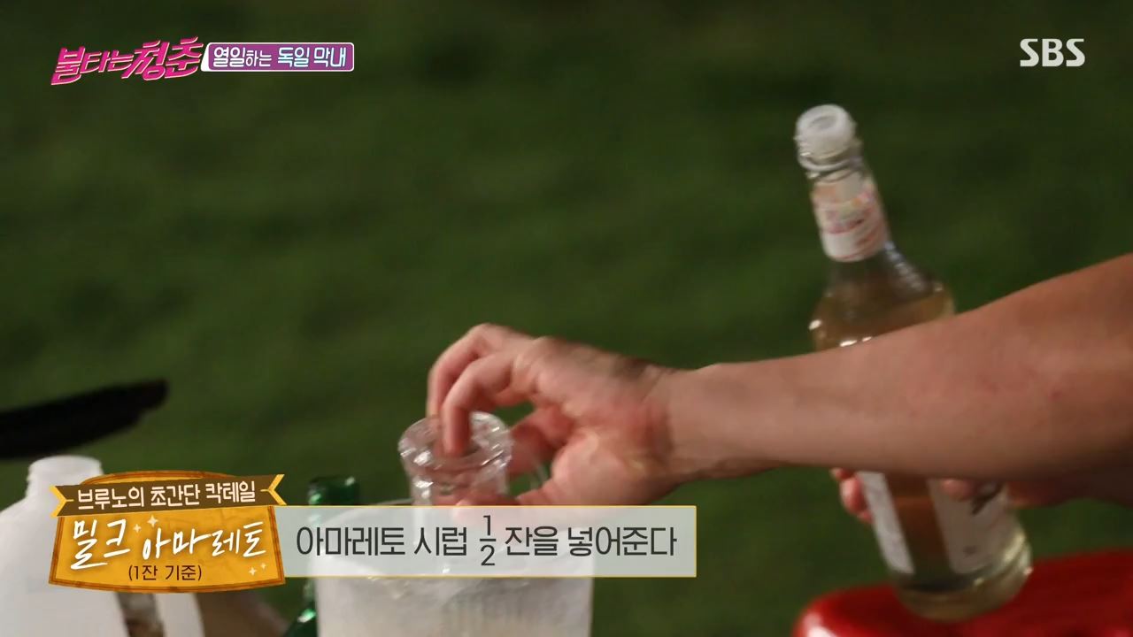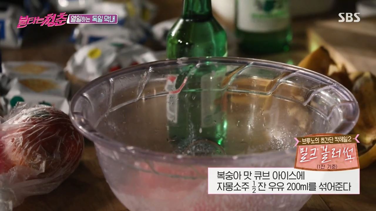 SBS '불타는 청춘' 제주도 편에서는 저녁 식사 후 새친구 유미를 비롯해서 최용준 양수경 등의 열차잉 끝나고, 방에 모여 도란도란 이야기를 나누던 중에 브루노가 불청 친구들을 위해 칵테일을 준비하는 모습이 나왔어요! 이날 브루노는 저녁식사 시간이 끝난 뒤 방에 모여 있는 멤버들에게 2차로 칵테일을 만들어오겠다고 말한 뒤 혼자 밖으로 나왔답니다! 브루노는 믹서기에 바나나, 소주, 우유, 아마레토 시럽을 넣고 크리미한 맛이 일품인 밀크 아마레토를 만들었습니다. 이어 복숭아 맛 큐브 아이스, 자몽소주, 우유를 넣은 달달한 맛의 밀크 블러썸도 만들었죠!