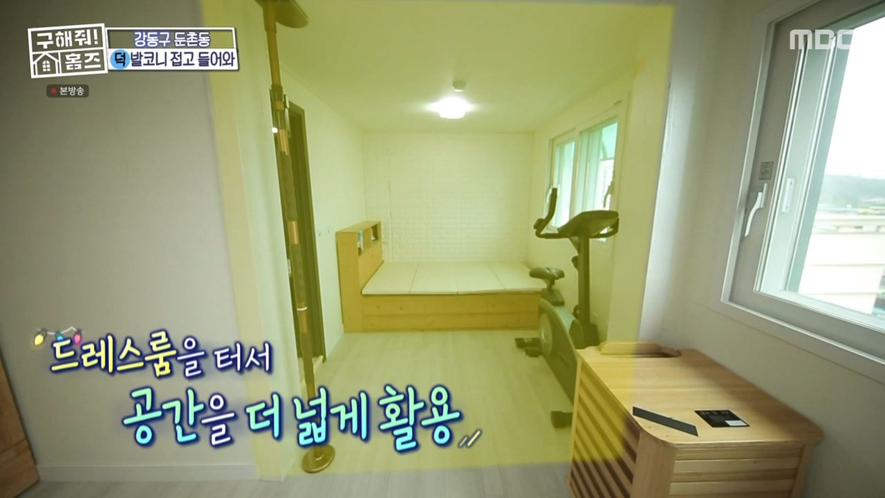 구해줘홈즈 둔촌동 아파트의 첫 번째 방은 방 하나가 더 있는 느낌으로 실내 구조가 꽤 넓었습니다. 드레스룸을 터서 더 넓은 공간으로 리모델링 한 구조였습니다. 붐은 안쪽을 좌식 평상과 같은 형태로 인테리어 디자인을 해서 부부만의 공간으로 사용하면 좋을 것 같다고 조언했습니다. 방 안에는 욕조가 포함된 화장실이 있었습니다.