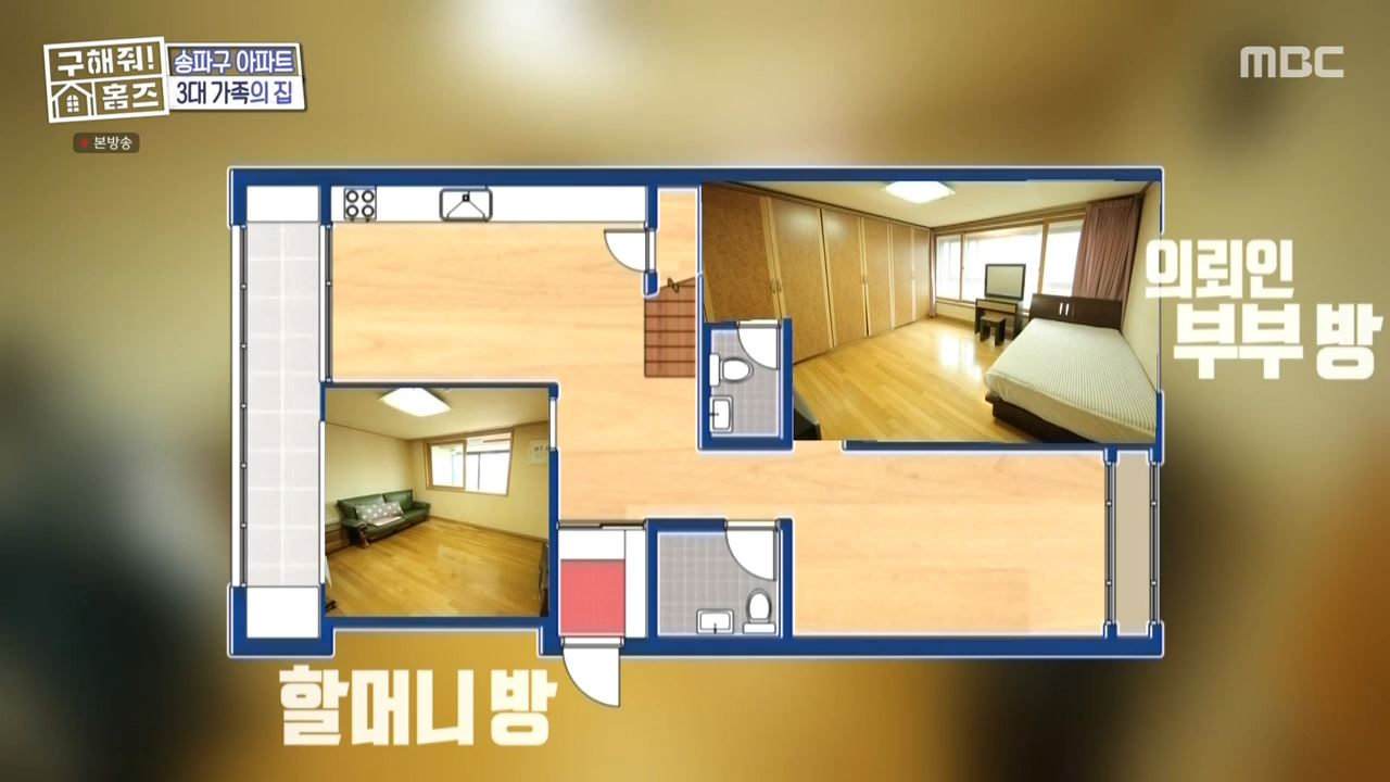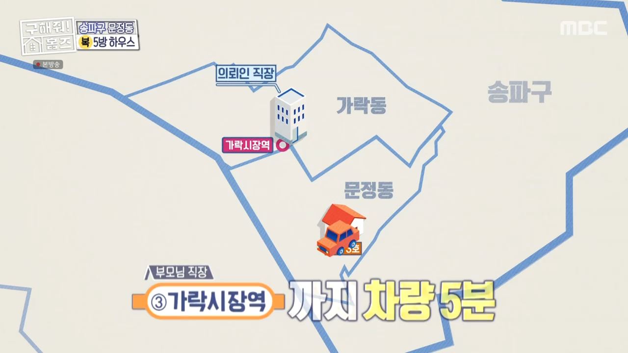 구해줘홈즈 송파구 문정동 복층 아파트는 매매가 11억 5천 만원. 박나래는 "12억 원인데 5천만 원 낮췄다"고 설명했습니다. 이후 김충재는 "제가 할머니와 살아본 사람으로서 5방 하우스'가 나은 거 같다"고 말했습니다. 김충재는 의뢰인의 직장에서 5분 거리인 송파구에 위치한 역대급 넓이의 '5방 하우스'를 최종 매물로 선택했습니다. 김충재는 "집이 가까우면 가족이 더 잘 모이게 돼있습니다. 실내 디자인은 1년에 방 하나씩 잡고 인테리어 디자인으로 꾸미면 된다"며 선택 이유를 전했습니다.