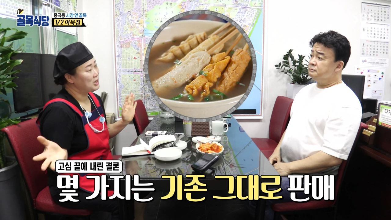 그럼에도 어묵집사장은 “그건 아니다. 오해다. 무작정 가격을 올리겠다는 게 아니다. 기존대로 부산어묵 5종류를 가되 비싼 어묵을 메뉴에 추가하고 싶다. 내가 생각하는 경쟁력은 맛의 변화보다 어묵 종류를 다양화해서 늘리는 거다”라며 말했습니다. 사장님의 말을 들은 백종원은 "그럼 기존에 안 팔리는 어묵들은 어떻게 하면 경쟁력을 가질까요? 지금은 부산어묵을 파는 여기 중곡동 어묵집에 종류가 부족해서 장사가 안 되는 것 같나?"라고 질문했습니다.